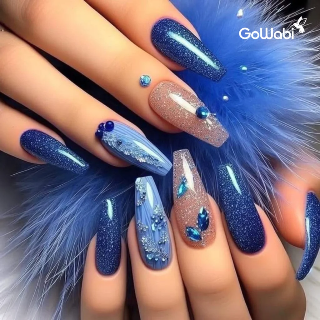 ใครเป็นสาวสายกลิตเตอร์ต้องจัดน้ำเงินประกายมุกหรือ Holographic Blue สีนี้จะช่วยให้เล็บของคุณดูโดดเด่นและเล่นแสงได้สุดปัง โดยเฉพาะเวลาโดนแดดหรือไฟแฟลชคือสวยจนละลายไปเลย ทุกการเคลื่อนไหวจะสะท้อนแสงอย่างมีมิติ ทำให้เล็บดูสดใสและเป็นประกายตลอดเวลา ลองแมตช์กับกากเพชรสีเงินหรือสีทองเพิ่มความวิบวับ บอกเลยว่าความสวยของคุณจะสะกดทุกสายตาให้หลงรักในทันที เหมาะสำหรับการออกงานปาร์ตี้สุด ๆ