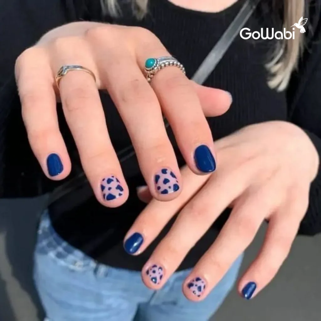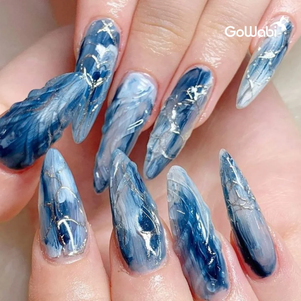 ถ้าคุณเป็นสายแฟชั่นตัวแม่ ต้องลองเล็บลาย Galaxy น้ำเงิน-ดำ ที่ให้ฟีลลึกลับน่าค้นหา สีนี้จะช่วยเพิ่มความดาร์กและเท่ให้กับมือคุณ ดูเหมือนการเดินทางในจักรวาลที่ไม่มีที่สิ้นสุด หรือถ้าอยากเพิ่มความเก๋ให้ลุคแซ่บสุด ๆ ก็ลองทำ Abstract Nails ที่เพ้นท์ลวดลายแนวอาร์ต ๆ ผสมโทนน้ำเงินเข้ม น้ำเงินพาสเทล พร้อมเส้นสีเงินหรือทอง เพิ่มความแวววาวสะกดทุกสายตาแบบไม่เหมือนใคร สีนี้เหมาะมากสำหรับสาว ๆ ที่อยากโชว์ความมั่นใจและมีสไตล์ไม่ซ้ำใคร