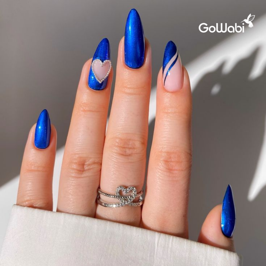 สีน้ำเงินก็สามารถให้ลุคหวานได้ ลองเลือกโทน Baby Blue หรือ Periwinkle Blue ที่ดูซอฟต์และละมุน เหมาะกับคนที่ชอบความน่ารักสดใส แต่ยังคงความหรูหราและมีเสน่ห์ สามารถเพิ่มลายหัวใจสีขาว ดอกไม้เล็ก ๆ หรือไข่มุกลงไปบนเล็บ เพิ่มความน่ารักและทำให้ลุคดู Cute แบบแพง ๆ คงความสดใสแต่ไม่ดูเด็กเกินไป ให้ลุคที่ดูดีในทุกโอกาส ไม่ว่าจะวันทำงานหรืองานพิเศษก็ดูเริ่ดไปหมด