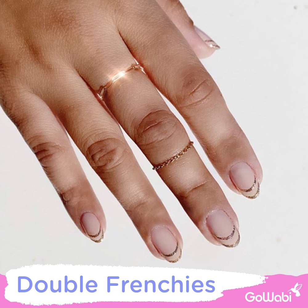 Double Frenchies สไตล์มินิมอลที่ตกแต่งด้วยลายเส้นสีทองสองเส้นที่ปลายเล็บ เรียบหรูดูเก๋ไปอีกค่ะสาวๆ เหมาะสำหรับสาวๆ ที่ไม่ชอบความเยอะ ชอบสไตล์มินิมอลแต่ได้ด้วยสีทอง ทำให้ได้ความเรียบหรูไปด้วยนะ