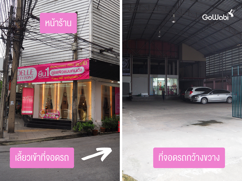 บรรยากาศภายนอกร้านโนแอล บิวตี้ พอยท์ สีชมพูสะดุดตา ใครมารถยนต์ส่วนตัวเลี้ยวเข้าซอยด้านข้างร้านแล้วไปจอดรถหลังร้านได้เลยค่ะ มีที่จอดในร่มกว้างขวาง ไม่ต้องกังวลเรื่องที่จอดรถเลย