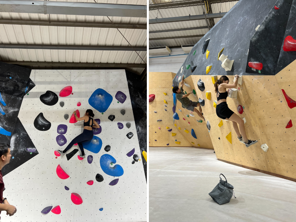ตัวหินที่ให้จับ จะมีขนาดเล็ก ใหญ่สลับกันไป ซึ่งค่อนข้าง challenge เหมือนกันค่ะ ว่าเราจะปีนไปทางไหน หรือเหยียบอันไหนดี บางผา มีความโค้งบ้าง ตรงบ้างสลับกันไป ทางสถานที่จะมีแป้งวางบริการให้เกือบทุกจุดไว้ใช้ตอนมือเริ่มเหงื่อออก เพื่อที่ว่าเวลาเราจับหินจะได้ไม่ลื่น