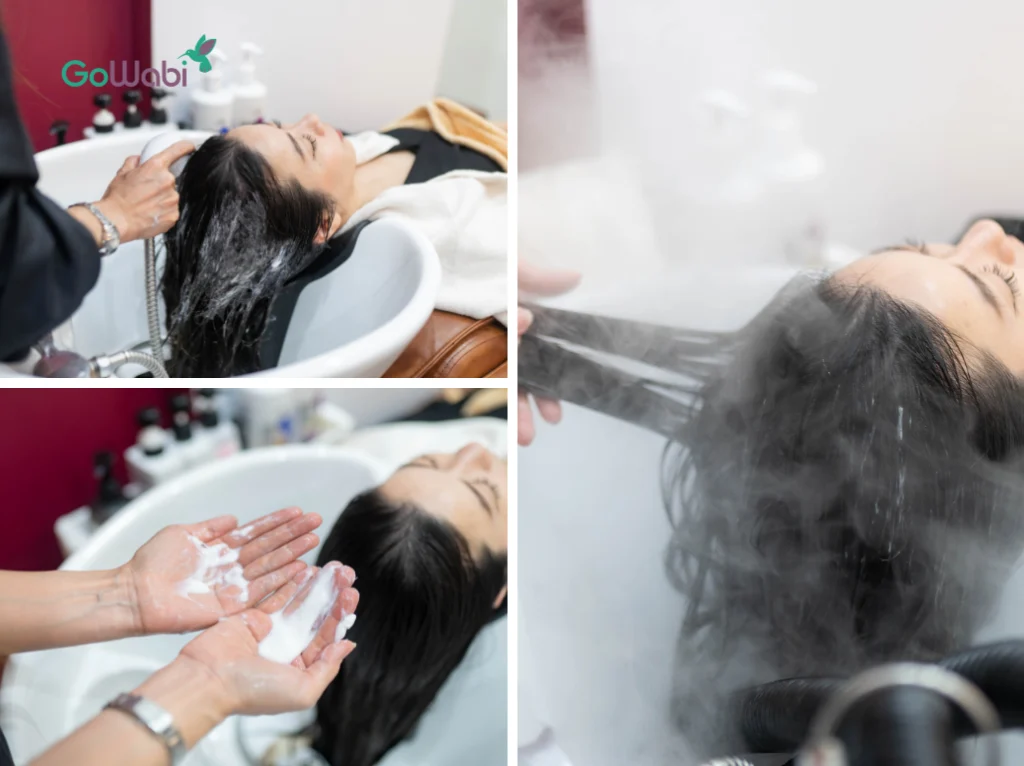 ที่เตียงสระ (แอบบอก เตียงสระผมที่นี่คือมีเบาะนวดด้วย นอนไปนวดไป สบายเว่อร์) ขั้นตอนแรกเลย ทางร้านจะสระผมเราประมาณ 2 รอบ โดยใช้แชมพูเปิดเกล็ดผม และไม่ลงครีมนวด ไม่ลงทรีตเมนต์