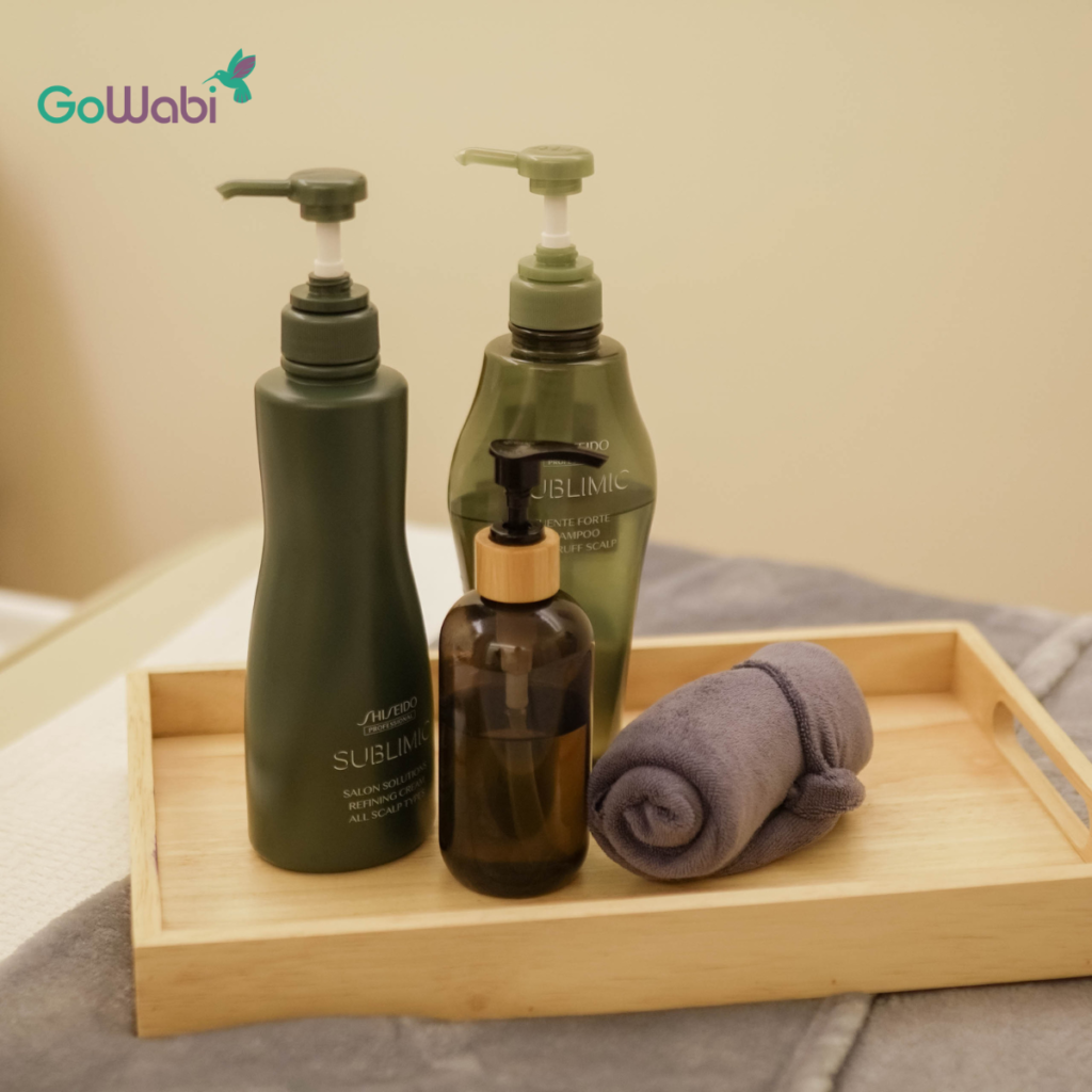สระผมพร้อมนวดศีรษะ ใช้ยาสระผมและครีมนวดจาก Shiseido ที่ช่วยบำรุงเส้นผมและทำให้หนังศีรษะสดชื่นสุด ๆ ค่ะ