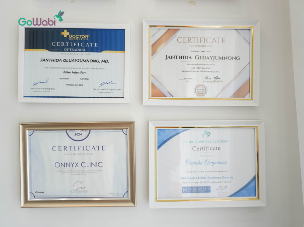 พอถึงแล้วประทับใจมาก คลินิกดูสะอาดสะอ้าน พนักงานต้อนรับดี สงบดีค่ะ คลินิกติดใบรับรองไว้บนกำแพงให้ลูกค้าดู พอเห็นใบรับรองหลายอันแล้วรู้สึกสบายใจขึ้นเชื่อถือได้เพราะว่ามีใบรับรองต่าง ๆ นั้นช่วยทำให้เรามั่นใจในระดับนึงเลยค่ะว่าคุณหมอที่นี่เขามีการอัพเดทความรู้ต่าง ๆ ตลอดเวลา และยังมีใบรับรองผลิตภัณฑ์ด้วยนะคะ มั่นใจได้เลยว่าของที่ใช้ที่ออนนิกซ์เป็นของแท้แน่นอน