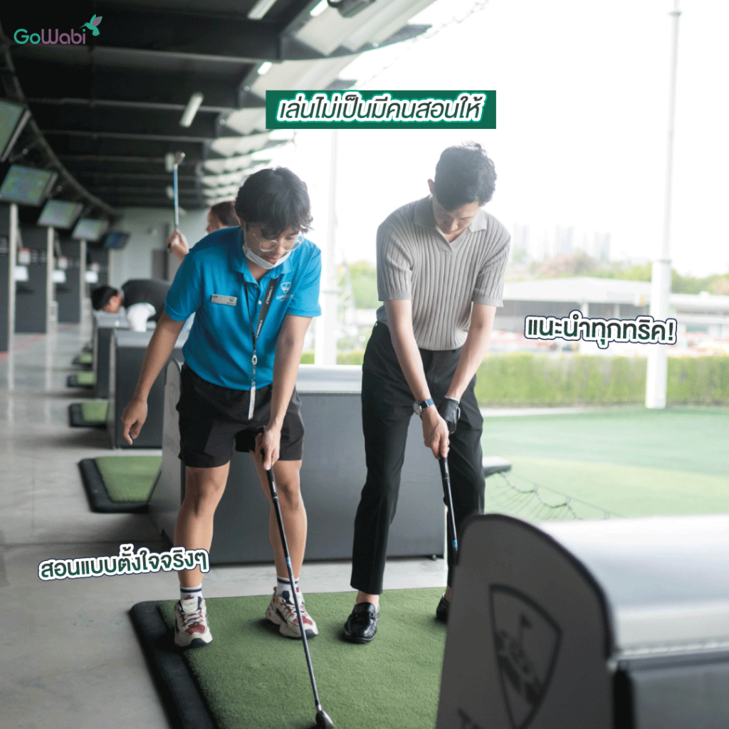 คุณจั่นเจา ได้แจ้งพวกเราว่าในแต่ละเบย์ จะมีผู้ดูแลหรือเรียกกันว่า พนักงาน/ทีมงาน ที่จะคอยแนะนำวิธีการเล่น และสอนเบสิกกอล์ฟ การจับไม้ การตียังไงให้โดน หรือทำคะแนนอย่างไรแบบไหนได้บ้าง นอกจากแนะนำการเล่นแล้ว เหล่า พนักงาน/ทีมงาน ยังสามารถช่วยแนะนำอาหาร หรือ pairing wine ได้ด้วย เริ่ดสุด ๆ การดูแลของเค้าก็ทั่วถึงมาก ๆ 2 คนต่อ 1 เบย์ ประทับใจมาก
